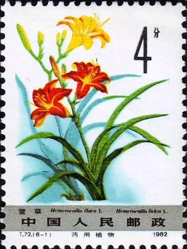 1982年5月20日,我国邮电部门发行了T72《药用植物(第二组)》特种邮票一套6枚。其中第一枚图案为萱草,画面以工笔彩绘摹画了两株萱草花,前者为红色,后者为黄色,还有含苞待放的花骨朵,画面简洁而不失美感。
