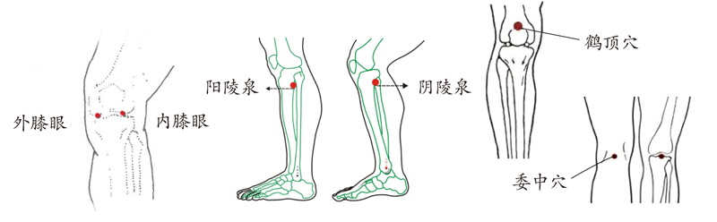 在内膝眼(在膝前侧,髌韧带内侧凹陷中)、外膝眼(在膝前侧,髌韧带外侧凹陷中)、阳陵泉(位于膝盖斜下方,小腿外侧之腓骨小头稍前凹陷中)、阴陵泉(在小腿内侧,胫骨内侧髁下缘与胫骨内侧缘之间的凹陷中)、鹤顶(位于膝关节上部,髌底的中点上方凹陷处)、委中(位于腘横纹中点,股二头肌腱与半腱肌腱中间)等穴位上进行按揉。(见下图)