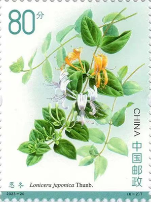 中国邮政于2023年10月11日发行《药用植物(三)》特种邮票一套6枚,由余天一设计。第二枚为忍冬,描绘了忍冬科藤本植物忍冬的枝条和花蕾。花初开时色白,经一二日则色黄,黄白交替,散发淡淡清香。因其茎叶常绿,凌冬不凋谢,故名“忍冬”。