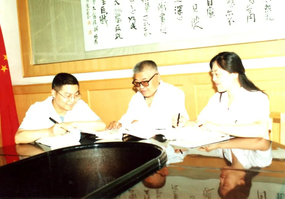 刘继祖(中)与其学术继承人曾斌芳(左)、张帆在研习中医经典。
