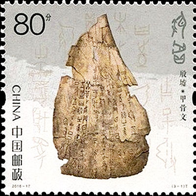 2016年7月13日中国邮政发行《殷墟》特种邮票一套3枚,由王虎鸣设计,河南省邮电印刷厂印制,邮票选取了殷墟出土的代表性器物刻辞卜骨、后母成鼎和玉蟠龙。第一枚为《甲骨文》,面值80分,是商代武丁时期的牛胛骨记事刻辞,其长32.2厘米、宽19.8厘米,正面刻辞4条,背面2条,共160余字,字内填朱,现收藏于中国国家博物馆,命名《祭祀狩猎涂朱牛骨刻辞》。说来有趣,这件殷墟出土刻有中国最早文字的牛胛骨器物便是中药“龙骨”,而且它的发现与中医中药有直接关联。这套邮票采用三连票形式,在背景中用一笔水墨贯穿全套三枚邮票,静物写实的殷墟器物与水墨写意背景相互辉映,不仅体现了三千年殷墟文化的传承和发展,而且展现了中国文明的丰富内涵和神秘色彩,也将通过中医药发现甲骨文的神秘趣事表达得淋漓尽致。