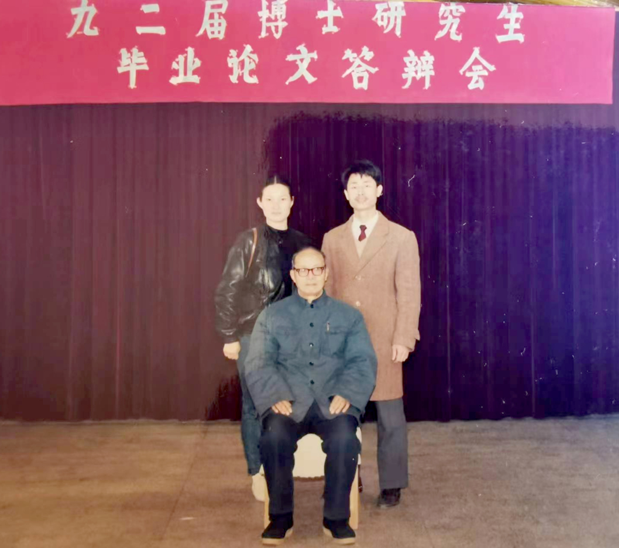 1992年,陈亦人(前排)与刘力红(右)及刘力红夫人赵琳(左)在博士研究生毕业论文答辩会上合影。