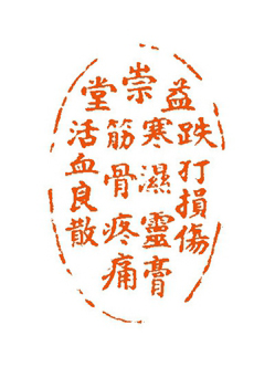 这方印章选用上好的寿山将军洞芙蓉石,在3.5厘米长、2.2厘米宽的椭圆形印面上,刻有“益崇堂,跌打损伤,寒湿灵膏,筋骨疼痛,活血良散”19个楷书小字,十分精到。边款则是用单刀法刻制的“义臣医师属正,庚辰十一月,巨来治印”字样。