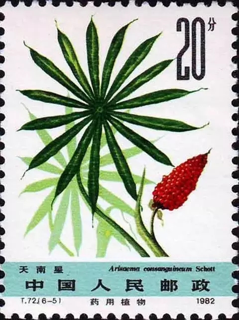 1982年5月20日,我国邮电部门发行了T72《药用植物(第二组)》特种邮票,设计者为邹建军。其中第五枚图案为天南星,画面以工笔彩绘描画了天南星的叶片,呈鸟足样分裂,其成熟的浆果密集如珠,红似石榴子,形如玉米棒,煞是好看。但这种美丽的植物却是一种有毒的草药,其根茎可以入药。