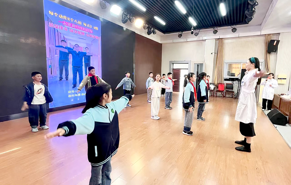 江苏省新沂市中医医院医护带领春华小学的同学们习练中医经络拍打操。