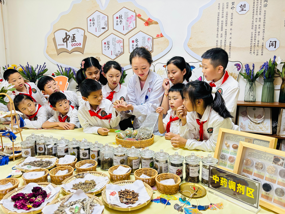 在四川省成都市温江区东大街第一小学,专家为小学生讲解中药知识。