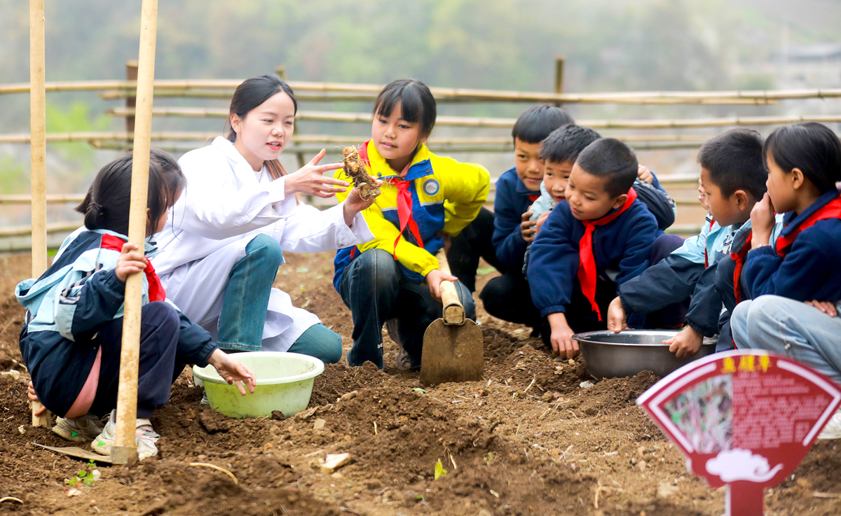 贵州省黔西市协和镇石人小学中草药文化实践基地,医务人员指导孩子们种植中草药。