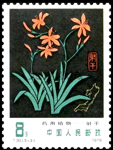 第三枚为射干,展现了鸢尾科植物射干的植株,其叶互生,呈扁平的宽剑形,枝端生数花,橘黄色,有暗红色斑点。邮票右下部以线描法描绘了其不规则的根茎,是射干的药用部位。