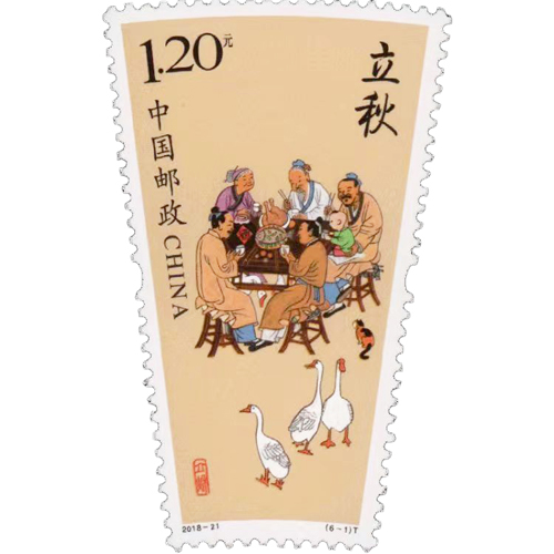 立秋,为我国二十四节气之一。中国邮政于2018年8月7日发行《二十四节气(三)》特种邮票1套6枚,邮票图案名称分别为:立秋、处暑、白露、秋风、寒露、霜降。上述6枚邮票的面值皆为1.20元。