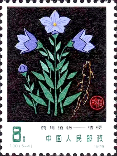 我国邮政部门于1978年9月15日发行《药用植物》特种邮票一套5枚,由潘可明设计。第4枚为桔梗,展现了桔梗科植物桔梗的植株,喇叭形花朵呈蓝紫色,右下以线描法描绘了其纺锤形的根,为药用部位。