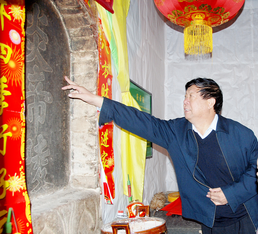 到了五谷庙后,我们先在庙外发现了一些残碑。庙里住的张老汉介绍,这里早年叫“皇坟”,好像供的是一位“城隍老爷”,但不知道这位城隍老爷究竟是何人。这里常有人来烧香上供,逢庙会时来的人就更多了。我想,这既然是“皇坟”,总该有碑刻说明吧?谁知问了半天,张老汉一直说没有碑刻。后来问急了,便说有一块碑,在另外的房间,钥匙被家人拿走了。话语支支吾吾,闪烁其词。于是我向张老汉解释,说自己就是团池乡党委书记米东明,所问的事情是负责任的,想让他打消顾虑。张老汉一听,顿时态度大转,这才道出真情:“碑是有,就在这家里。”我们顺着他手指的方向看去,正堂供桌后挂着一张写有“天地英雄气”的大字画卷。张老汉说:“就在那后面。”我掀开画卷,后面是一幅因年久而颜色发黄的毛主席像,揭开毛主席像贴附的旧报纸,一个凹陷进去的墙洞呈现在眼前。墙洞里黑乎乎一片,什么也看不清。用手一摸,像是一块沾满厚厚油烟黑灰的石碑。我立刻吩咐司机拿来擦拭轿车用的毛巾,蘸着张家人端来的一盆清水,反复擦洗起来。擦了足足有20多遍,才看清碑上有三个大字——“炎帝陵”。至此,这个旷世大发现的第一证据终于重见天日,成为“高平发现炎帝陵”的标志性事件。