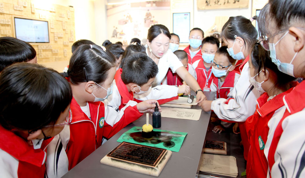 2022年9月,在五寨县中医药文化体验馆开展的“中医药文化进校园——开学第一课”活动中,五寨县学生们正在动手体验活字印刷中医名句。
