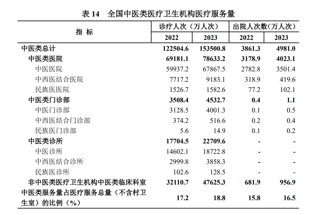 2023年,全国中医类医疗卫生机构总诊疗人次15.4亿,比上年增加3.1亿人次(增长25.3%)。其中:中医类医院7.9亿人次(占51.2%),中医类门诊部及诊所2.7亿人次(占17.7%),非中医类医疗机构中医类临床科室4.8亿人次(占31.0%)。
