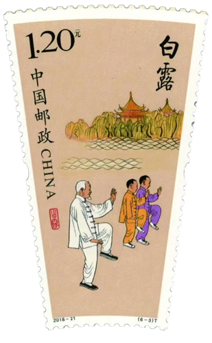 2018年8月7日,中国邮政发行《二十四节气(三)》特种邮票1套6枚,分别表现了立秋、处暑、白露、秋分、寒露、霜降这秋季的六个节气。本套邮票由中央美术学院刘金贵教授和著名邮票设计师王虎鸣设计,其中第三枚是白露节气,画面表现的是一位精神矍铄的老人带领两位年轻人练习太极拳的场景,而远处的亭台楼阁,水波荡漾,让人们仿佛感觉到秋风阵阵、秋意渐浓。