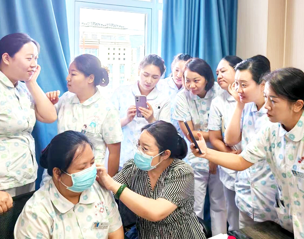 江苏省中医院护理部副主任护师蔡晖(前排左二)为凉山州中西医结合医院护士演示耳诊和耳穴疗法。