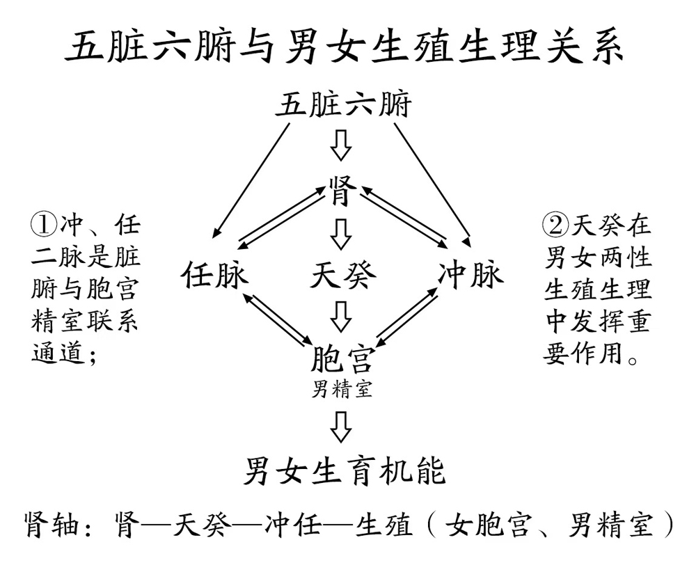 此处经文,是对上文《素问·上古天真论》所论男女两性生理周期的“肾—天癸—冲任—生殖器官(女胞宫、男精室)—生殖生理轴”理论的细化和补充。