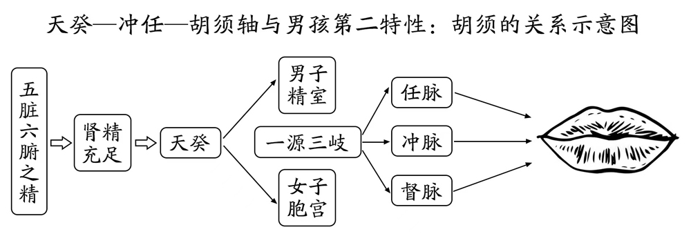 此节经文,以胡须形成机理为例,论证了冲脉、任脉与儿童性征(胡须)的关系。冲脉、任脉、督脉,一源三歧,同起于胞中(女子为子宫、男子为精室)。冲脉为十二经脉之海、任脉为人身阴脉之海,主宰和妊养胎儿,其中浮行于体表的部分,沿腹部上行,会于咽喉部,别行而络唇口。唇中周围是胡须生长的部位,冲任之脉“血气盛则充肤热肉,血独盛则澹渗皮肤,生毫毛”。故冲任之脉气血的盛衰,决定着胡须的有无和生长,实乃“天癸”决定着男女两性的体毛(主要指胡须、腋毛、阴毛)的生长。鉴于《黄帝内经》时代,不可能认识到男孩长胡须、女孩不长胡须与体内雄性激素有关,所以,就从人体的天癸、冲、任、督三脉的关系和功能予以阐述,能够认识到生长胡须是男女两性重要的性征差异,也是十分难能可贵的。