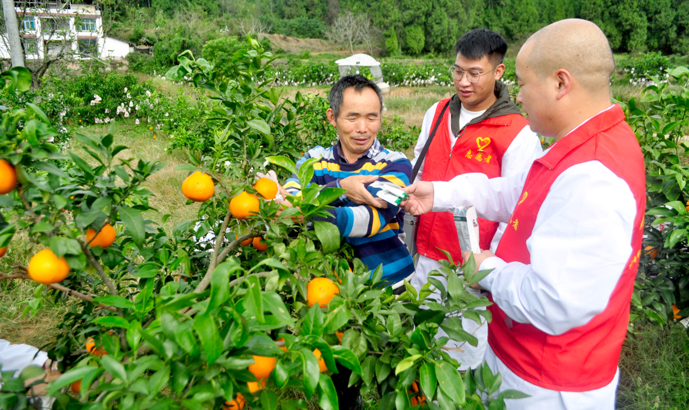 11月4日,四川省绵阳市梓潼县卫生健康局组织医务人员、党员志愿者开展冬季“预防流感守护健康”巡回义诊活动,为村民提供便捷、高效的医疗服务,同时免费发放预防感冒的板蓝根颗粒、荆防颗粒等中成药。图为医护人员给村民发放中成药。成和平摄
