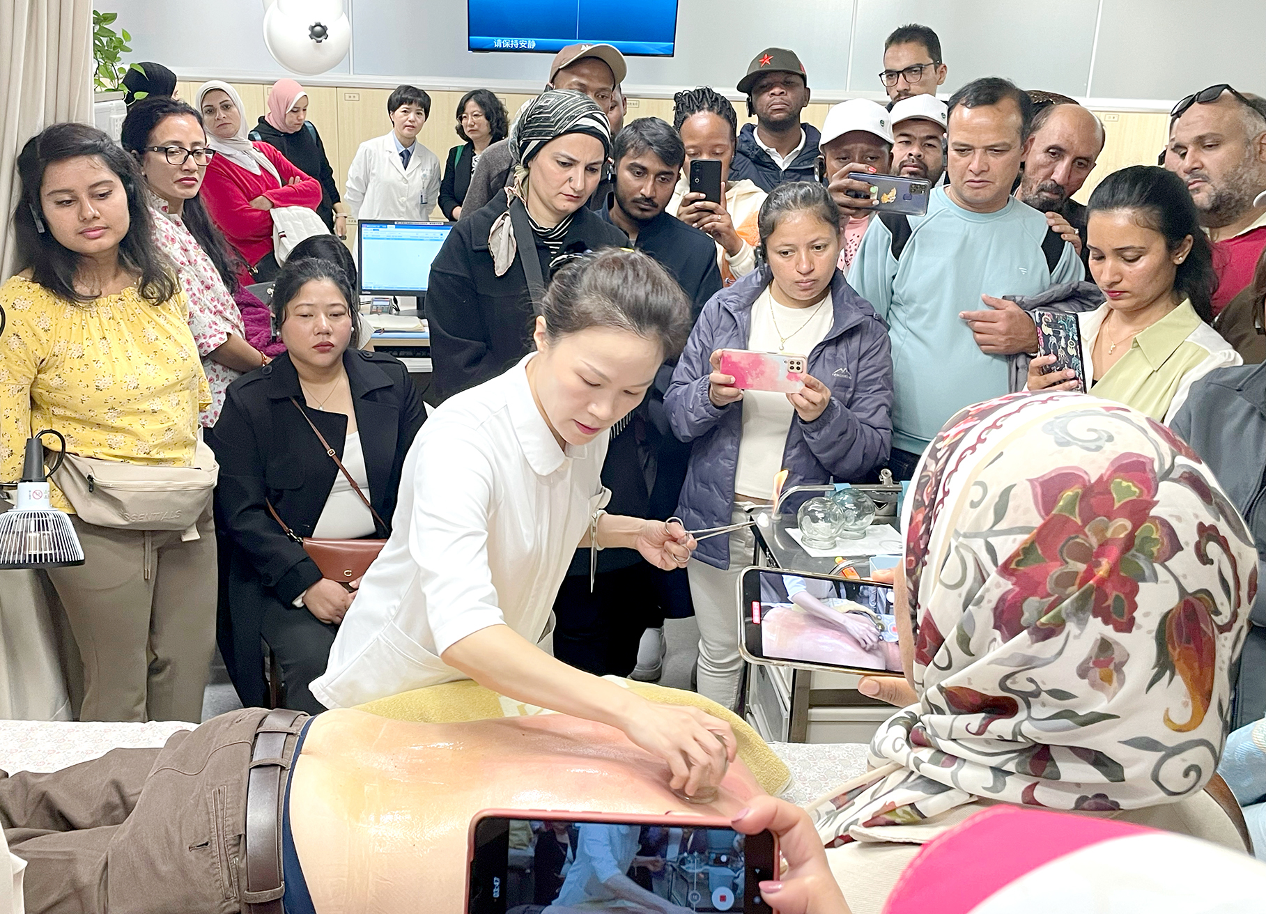 日前,浙江杭州市中医院丁桥院区迎来尼泊尔等6国50余名医务工作者体验中医药。在中医综合治疗室,护士徐星星介绍了刮痧、平衡火罐、耳穴贴压、火龙灸、葫芦灸等三十多项中医适宜技术以及一些技术的操作方法和适应症,并辨证施治,让一位腰痛患者现场体验平衡火罐技术,让外国医务工作者直观感受到中医适宜技术的疗效。