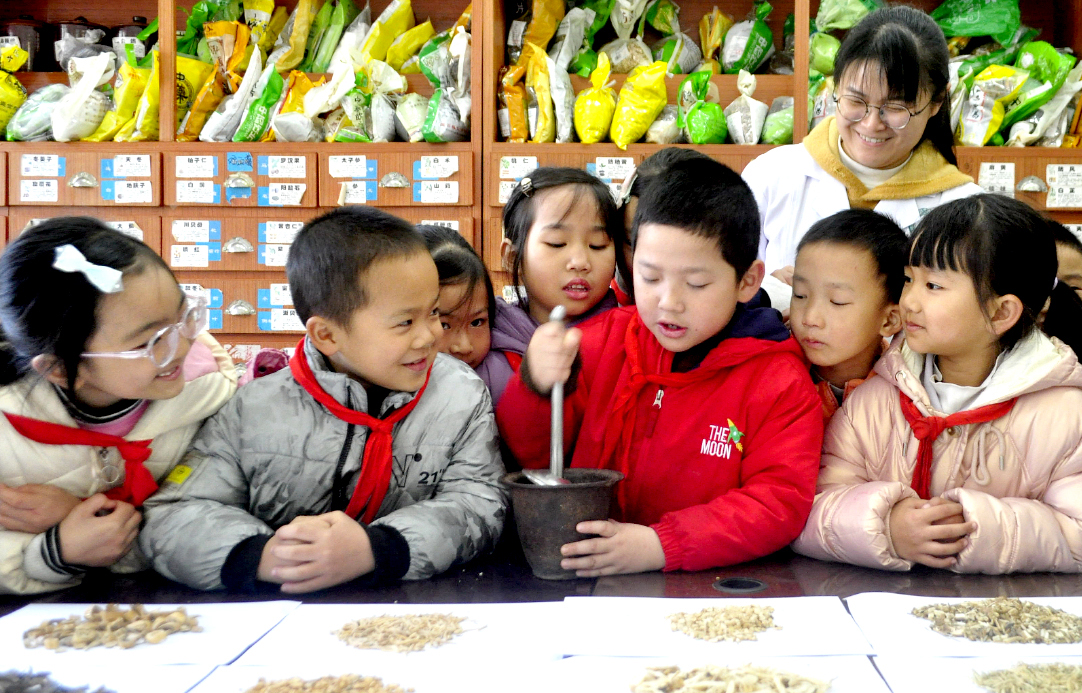 2024年12月3日,四川省绵阳市梓潼县建兴卫生院邀请当地小学学生到中医馆,开展“体验中医文化”主题活动,孩子们通过学习辨识中药材、体验传统中药房常用工具杵臼捣药、制作香囊,近距离感受中华优秀传统中医文化独特的魅力。成和平摄