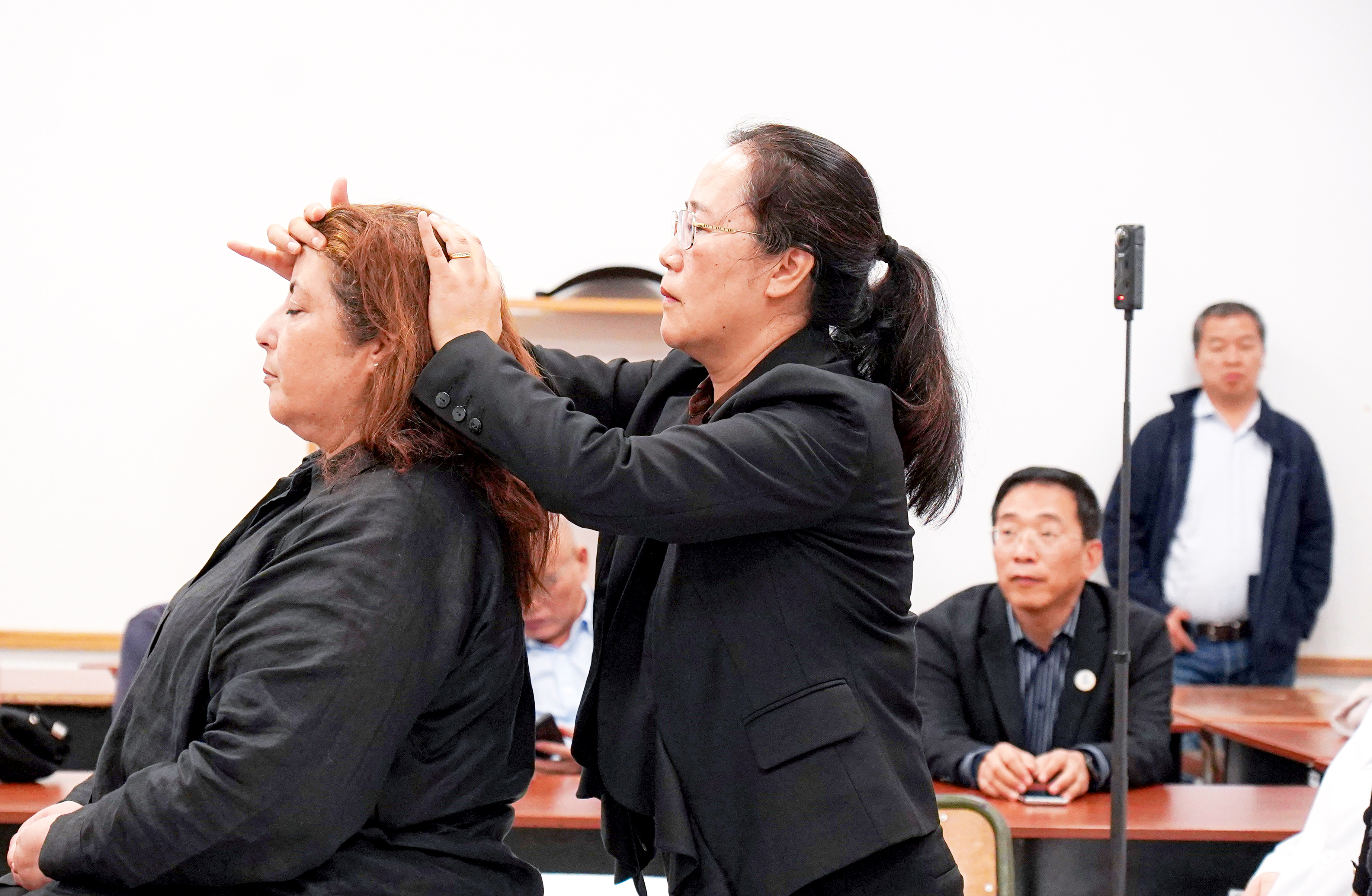 图为世界中联国际名师带高徒项目指导老师顾植山教授带教法国徒弟王淑萍针刺治疗外国患者。