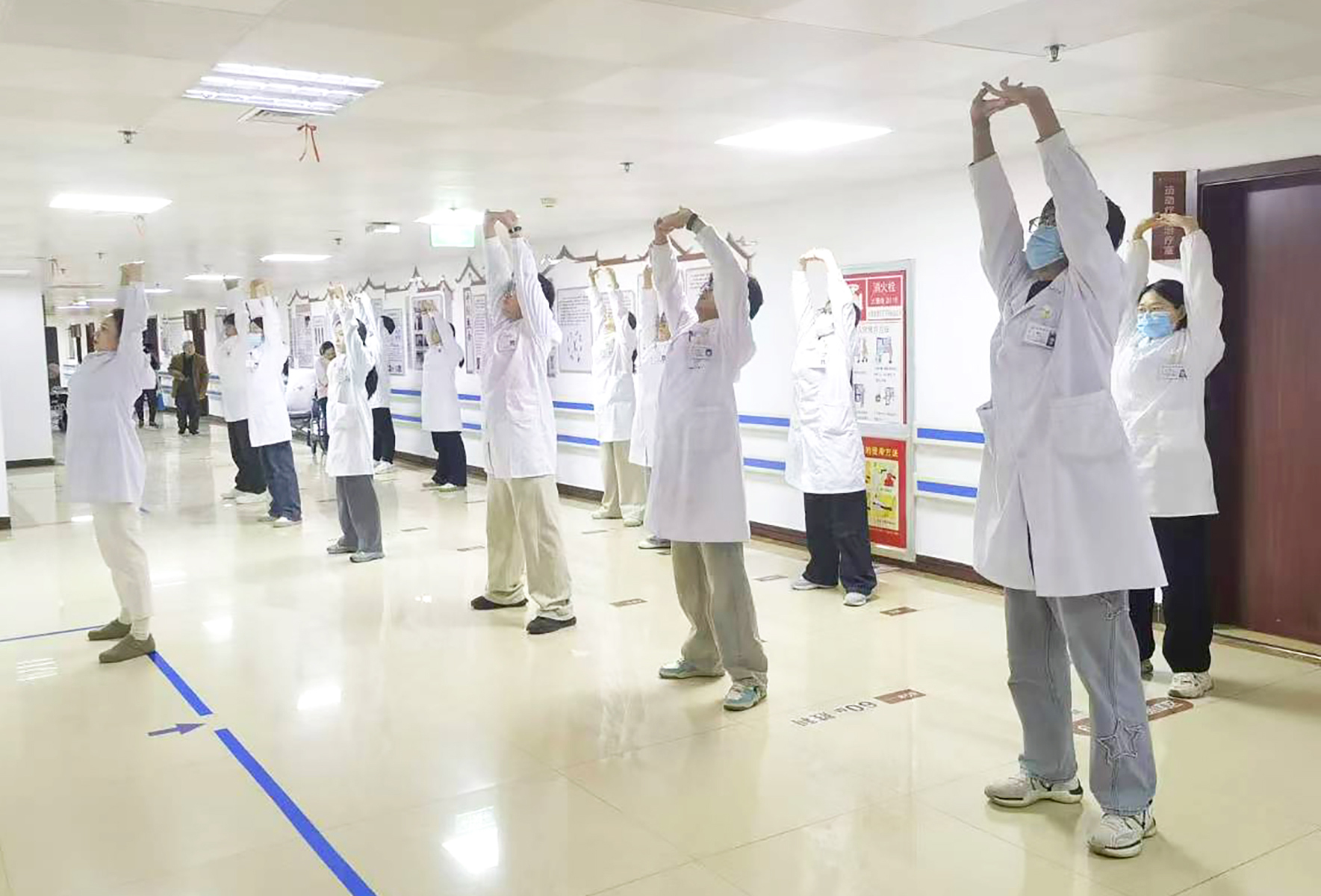 郑州市中医院康复科每周二早上07:40在治疗大厅由刘鑫医师带领规培医师、进修医师、康复骨干培训医师、实习生进行八段锦12分钟全程练习。郭威力摄