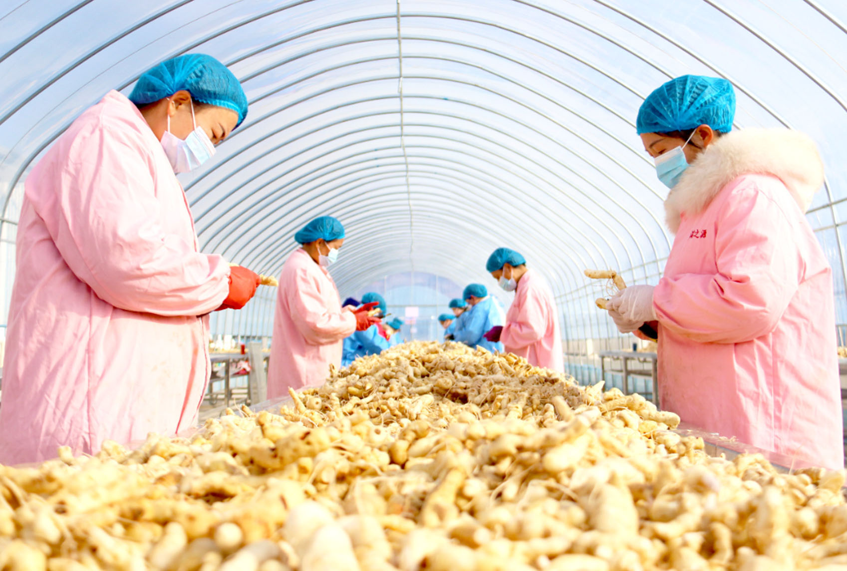 图为1月8日,河南省内乡县夏馆镇湍之源农业(河南省)有限责任公司员工正在挑选、加工黄精。 王小军摄