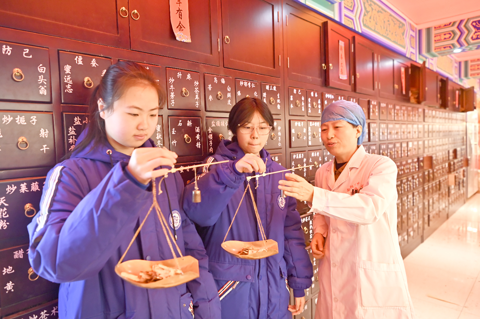 图为中学生在南阳市中医院学习中药称重。王小军摄