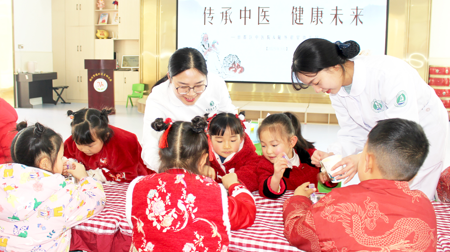 近日,湖北省随州市曾都区中医医院医护人员走进当地幼儿园开展中医药文化进校园活动,小朋友在指导下制作中药穴位贴,并体验中药穴位贴敷。