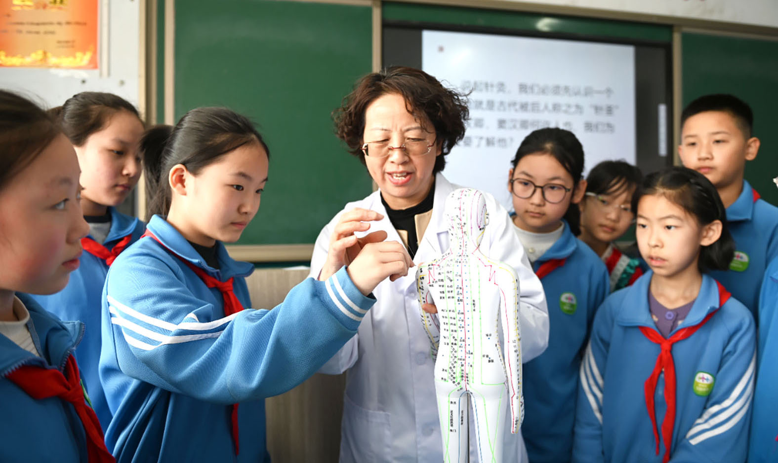 日前,河北省邯郸市肥乡区卫生健康局组织开展中医药文化进校园活动,通过组建中医药兴趣社团、开设“中医文化课堂”,让学生学习中医药知识,感受中医药文化魅力。图为肥乡区中心医院中医师为肥乡区第一实验小学学生讲解针灸知识。唐志峰摄