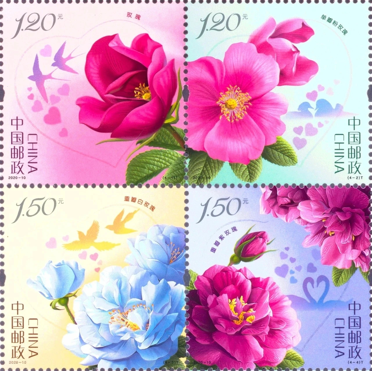 2020年5月20日,中国邮政发行《玫瑰》特种邮票,一套4枚,图案名称分别为:玫瑰、单瓣粉玫瑰、重瓣白玫瑰、重瓣紫玫瑰。该套邮票由宋鉴设计,采用装饰性手法,将4种玫瑰围绕线条勾勒的“心”形加以展示,姿态优美,色彩艳丽,栩栩如生,同时,在背景中融入燕子、鸳鸯、喜鹊、天鹅等爱情鸟图案,其优雅的剪影在光线下散发着柔和的光泽,颜色随着光线而变化,轻盈灵动,仿若穿梭在七彩祥云间,进一步营造出了玫瑰的浪漫与美好。