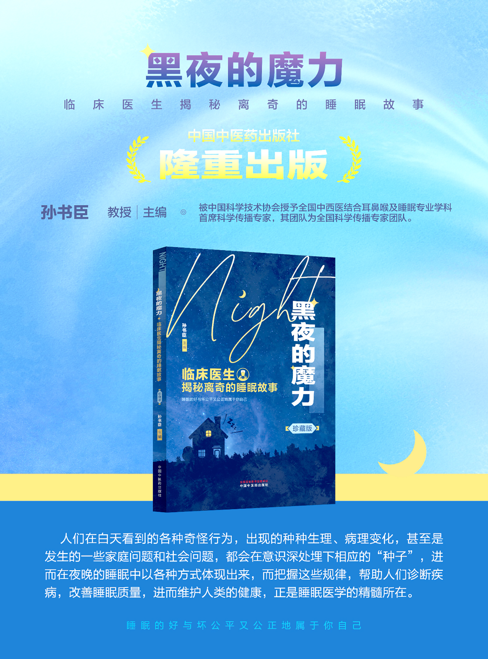睡眠医学是一个新兴的学科,随着它的发展,许多疾患的深层次病因逐渐揭示。而把握这些规律,帮助人们诊断疾病、改善睡眠质量,进而守护人类的健康,正是睡眠医学的精髓所在。为响应2025年世界睡眠日“健康睡眠优先之选”主题倡导,由中国中医科学院广安门医院南区睡眠中心首席专家、主任医师孙书臣主编的睡眠医学科普书《黑夜的魔力:临床医生揭秘离奇的睡眠故事》(珍藏版)以全新面貌重磅回归。这部由孙书臣医学团队倾力修订的珍藏版,将带领读者穿越迷雾,在科学与人文的交织中探寻睡眠的真相。