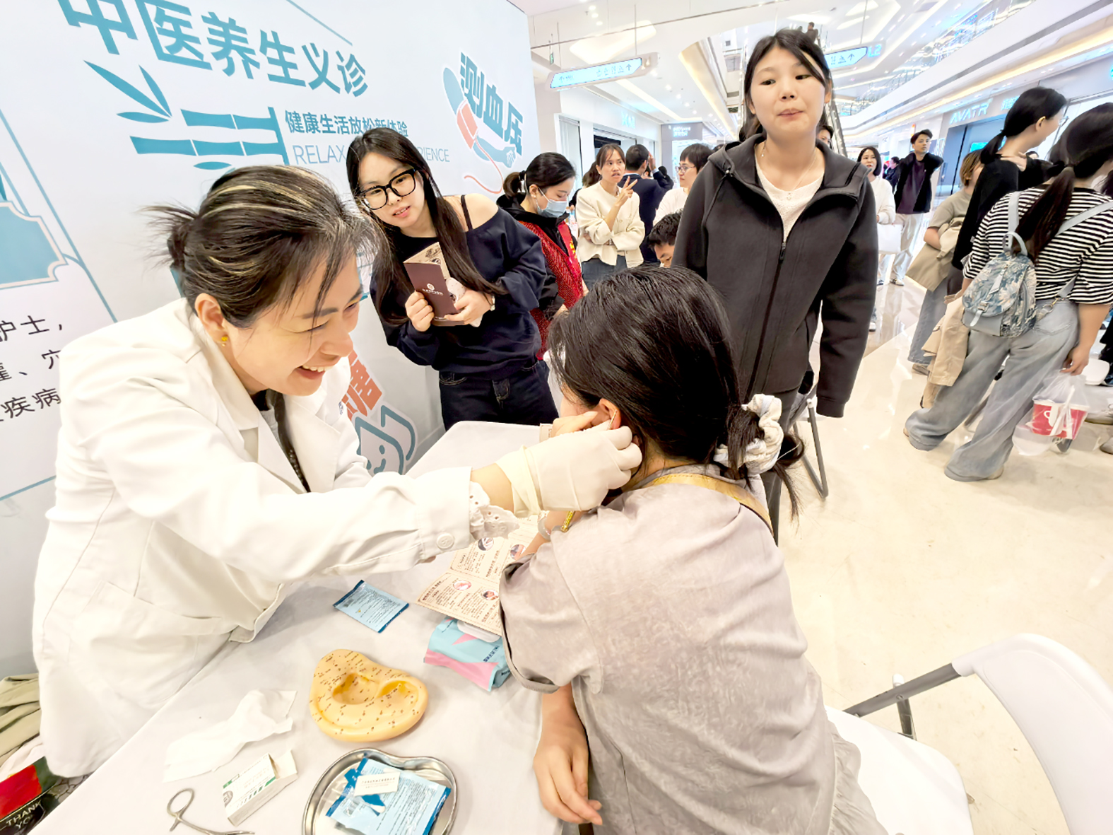 4月26日晚上,浙江省桐乡市中医医院在该市吾悦广场开展义诊活动,在广场上设“义诊区”“中医特色疗法和传统疗法体验区”“针灸推拿体验区”为市民提供望闻问切、中医适宜技术体验等中医传统及特色医疗服务,同时设有“中药相关产品展示体验区”“药食同源产品品鉴区”。此次夜市活动受到市民的欢迎。图为义诊现场。