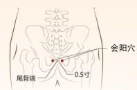 会阳,足太阳膀胱经腧穴,在骶部,尾骨端旁开0.5寸。会,指会合、交会;阳,指阳经、阳气。本穴在尾骶骨两旁,是足太阳膀胱经与督脉两条阳经交会之处,故名,具有益肾固带、通理二便的功效。按揉会阳穴,为局部取穴,可疏导肛门瘀滞,畅行气血,有效防治痔疮。按揉时可扩大范围,兼顾临近的次髎、秩边等穴,起到增强清泻湿热、消瘀导滞、缓解痔疮疼痛的作用。