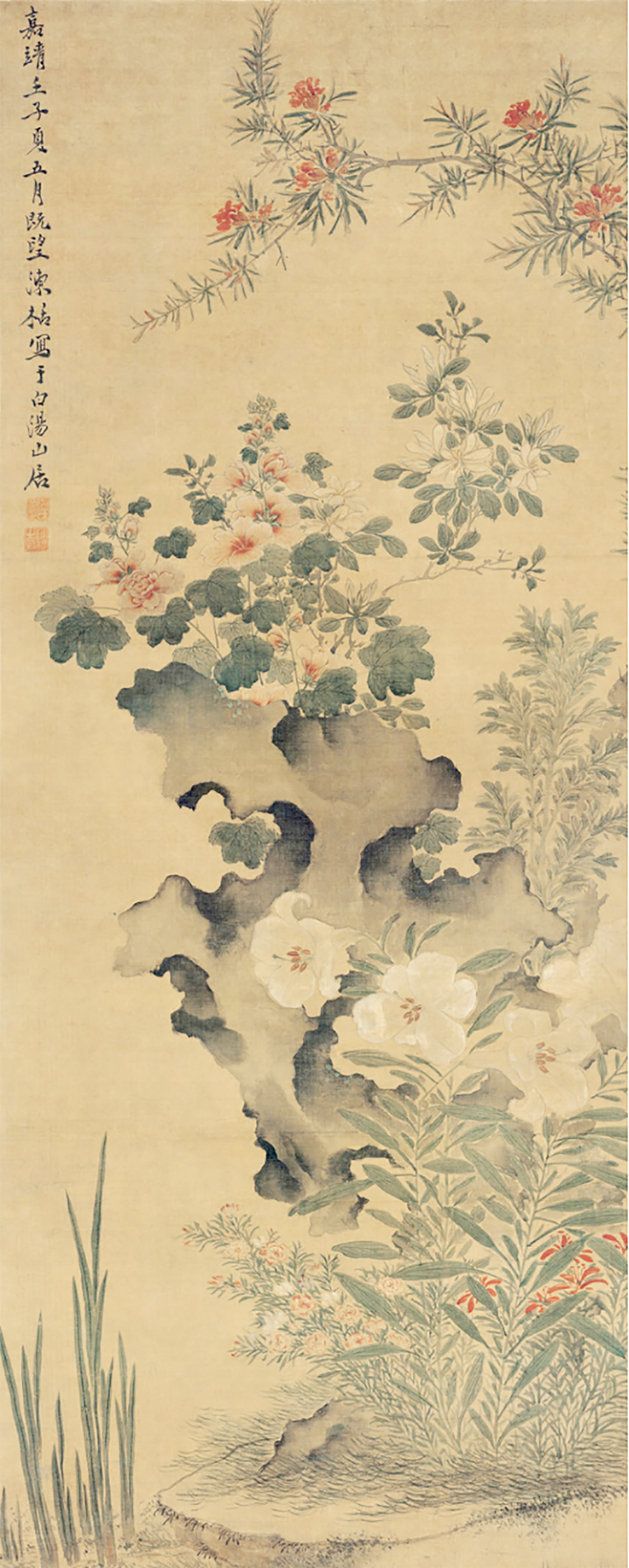 古人有端午挂“端阳景”画的习俗,以趋吉避凶。明代陈栝《端午即景图》便是一幅“端阳景”画,全图用笔虚实变化丰富,花木寄寓迎祥纳福之意。画中展现的是端午节期间“葵榴斗艳,栀艾争香”之景。画作以湖石为分隔,共绘节令花卉草木九种,即菖蒲、艾草、百合、山丹、石竹、灵芝、石榴、蜀葵、栀子,充分体现了“端午百草皆是药”。