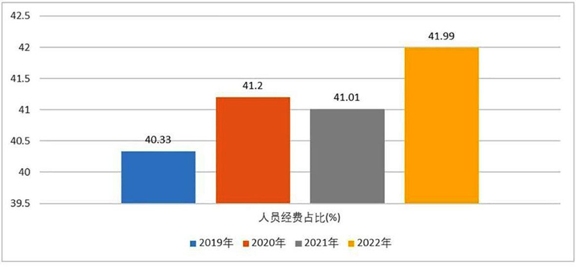 二是收支结构不断优化。医疗服务价格动态调整并持续优化,医务人员的技术劳务价值得到进一步体现。在医疗收入结构方面。2022年全国二级公立中医医院医疗服务收入占比为33.26%,较2021年提升0.02个百分点;除检查检验收入占比有所提升外,卫生材料收入和药品收入占医疗收入比例分别较2021年降低0.18个和0.75个百分点。其中,重点监控高值医用耗材收入占比为31.75%,较2021年下降4.78个百分点,重点监控化学药品和生物制品收入占比为1.35%,较2021年基本保持稳定(见图7)。在人员经费支出方面。人员经费占比为41.99%,较2021年提升0.98个百分点,人员经费支出增幅达到5.04%(见图8)。二级公立中医医院通过充分落实“两个允许”要求,不断完善维护公益性、调动积极性、保障可持续的运行机制。