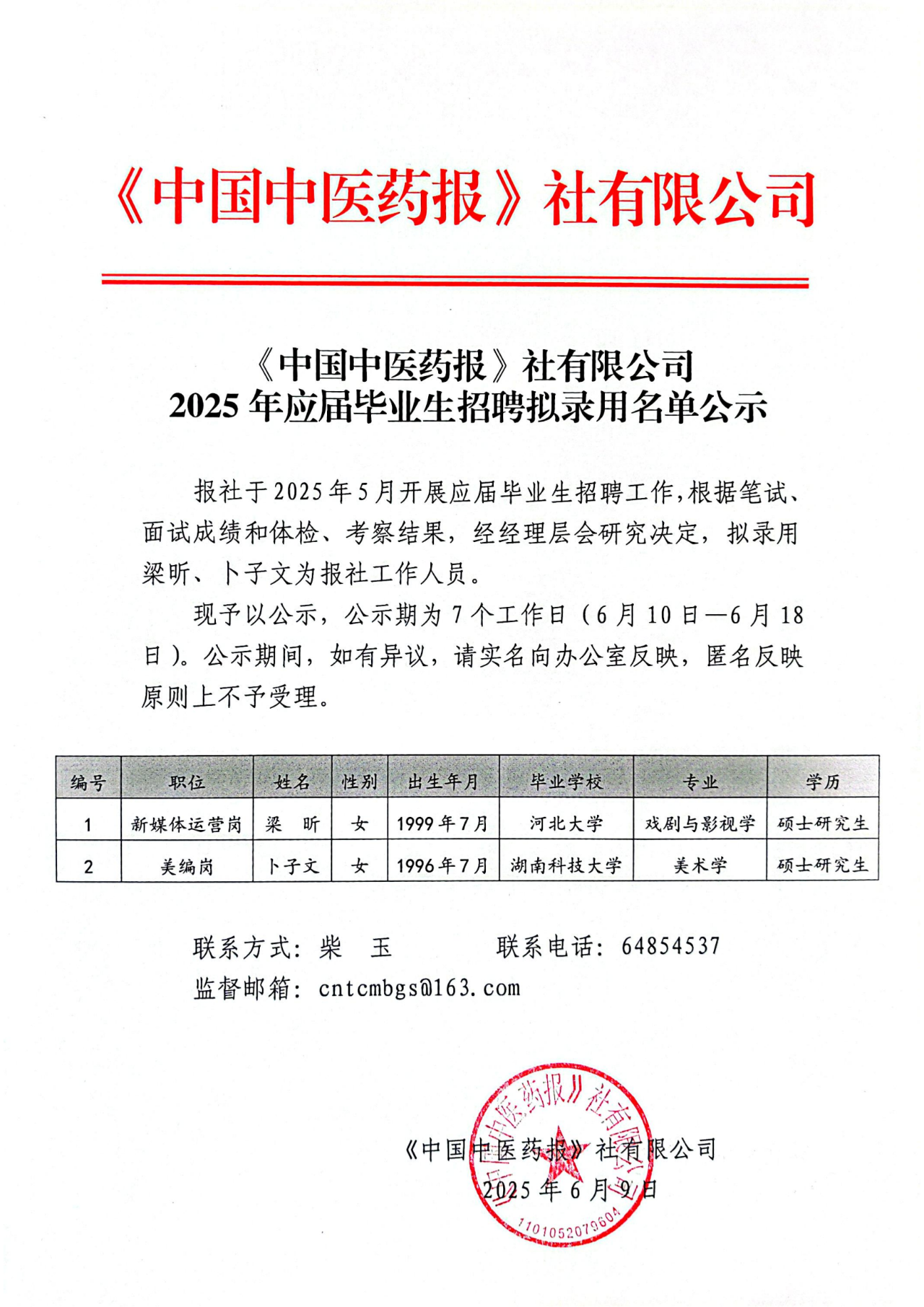 《中国中医药报》社有限公司2025年应届毕业生招聘拟录用名单公示
