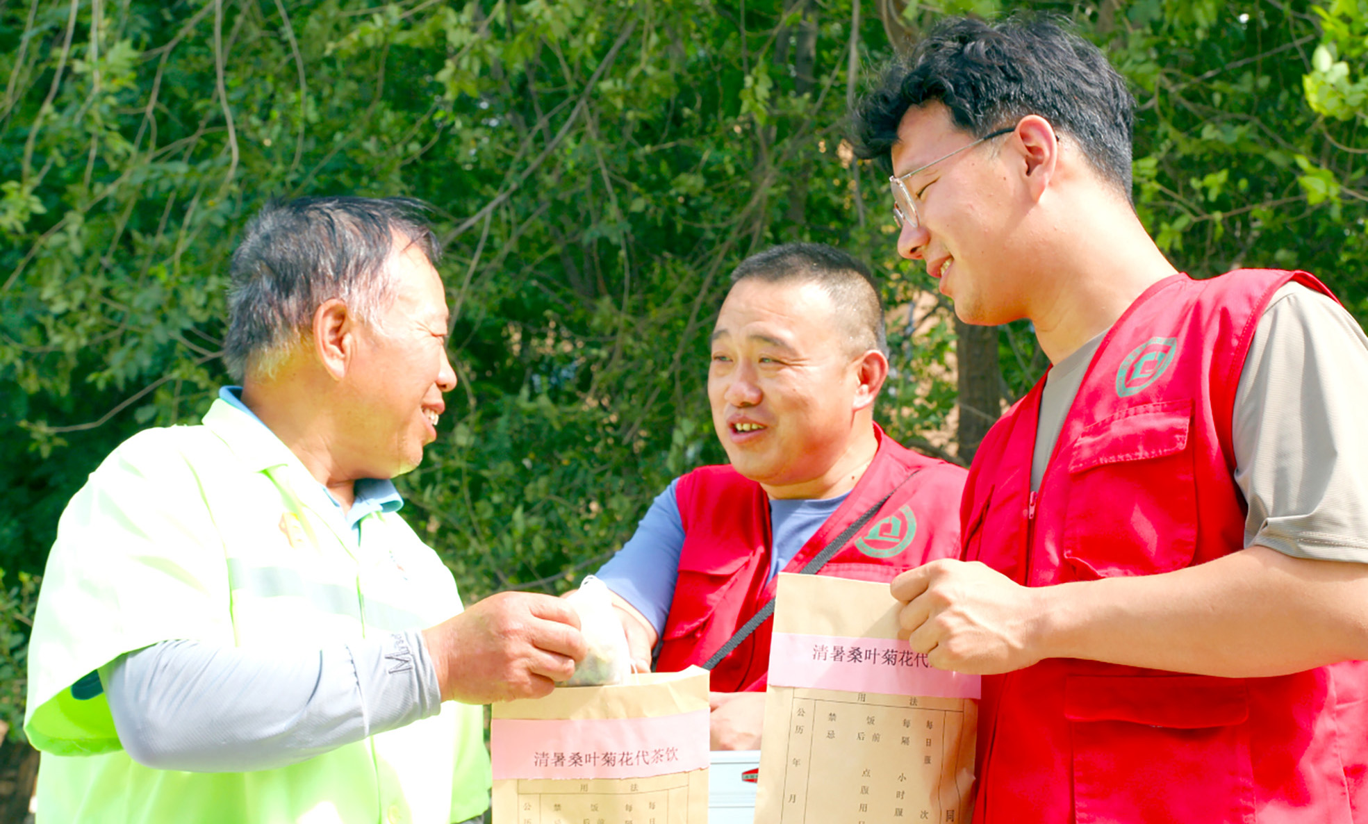 图为家庭医生为环卫工人发放清暑代茶饮。张磊摄