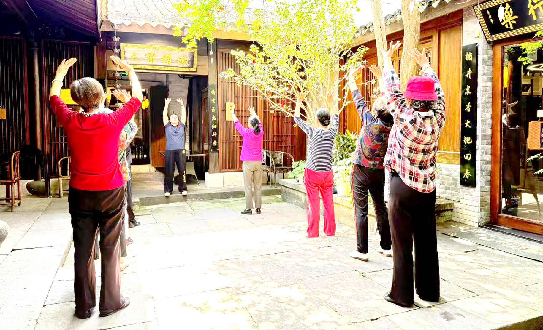 图为居民们在习练五禽戏。