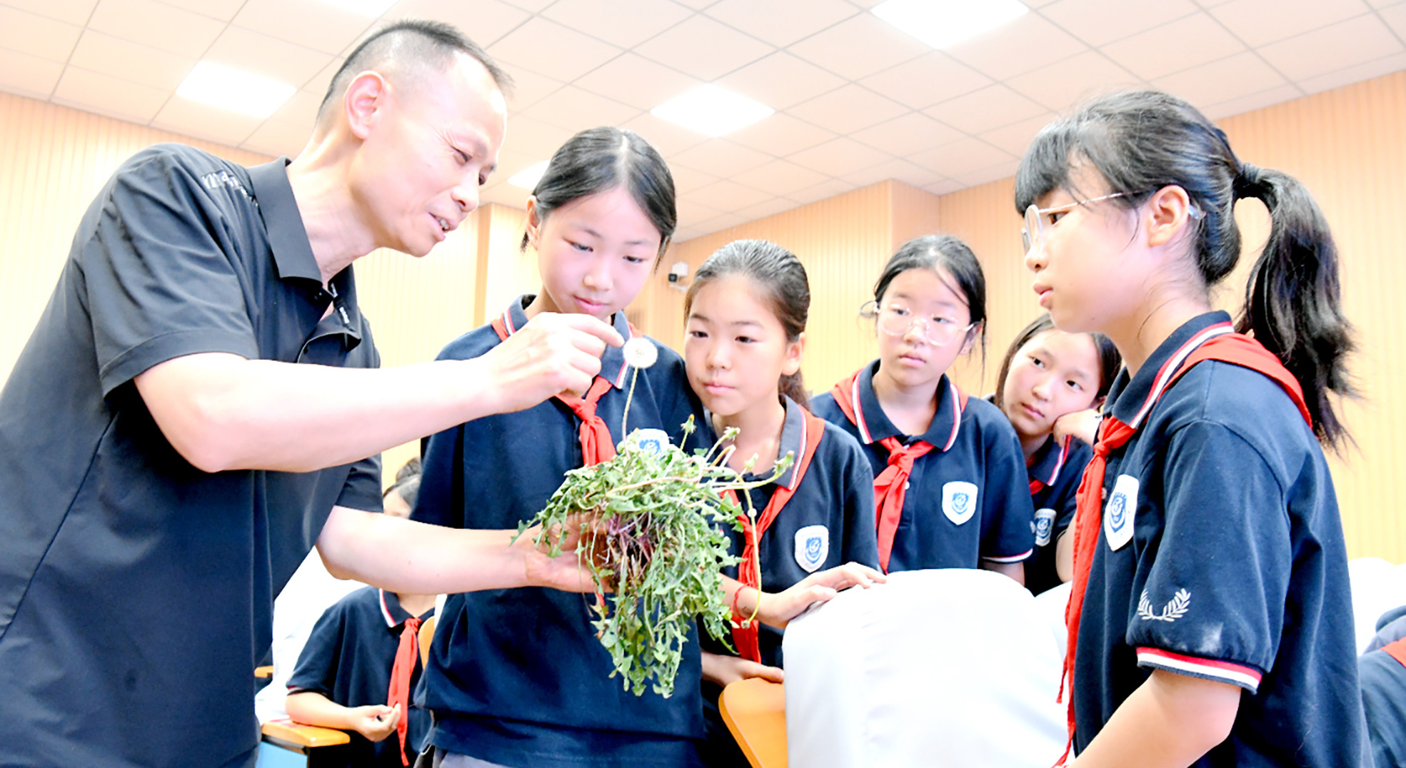 近日,安徽省太和县中医院组织医生走进该县如意路小学开展中医药文化进校园活动,为学生讲解中药材及穴位知识,并带领学生体验按摩手法。图为该院主任中药师陈刚为学生讲解蒲公英的性味归经与功效。