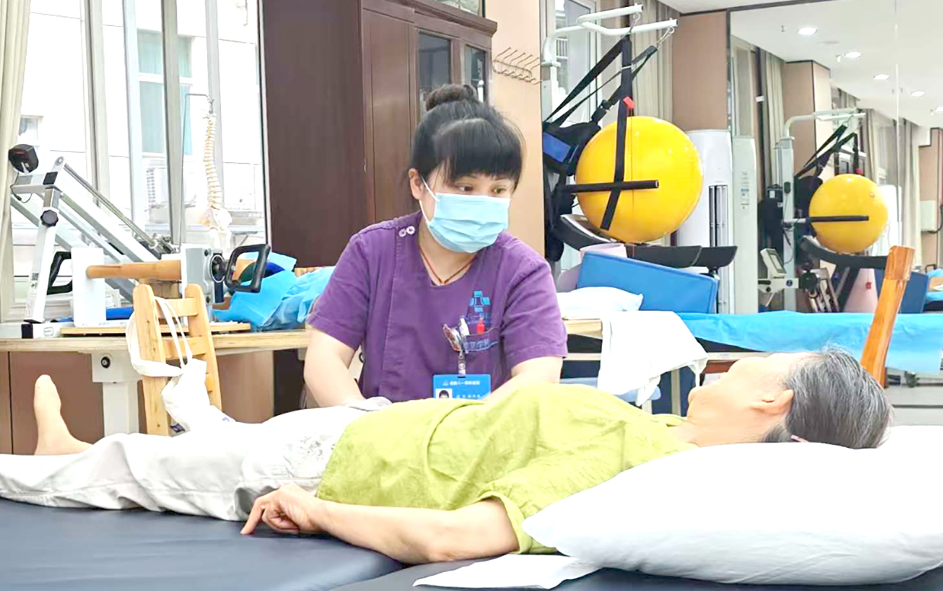 图为日前该院康复诊疗中心的治疗师程平月为高龄股骨头坏死患者进行功能康复锻炼。