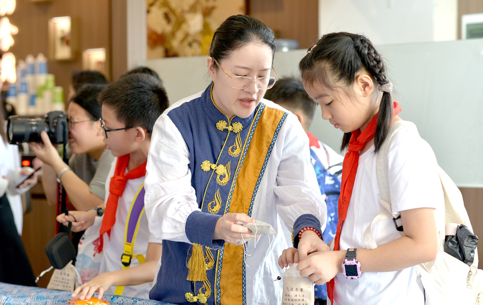 图为来自南宁、柳州、贵港、河池、崇州等地的小学生,在医院现场学做香囊。
