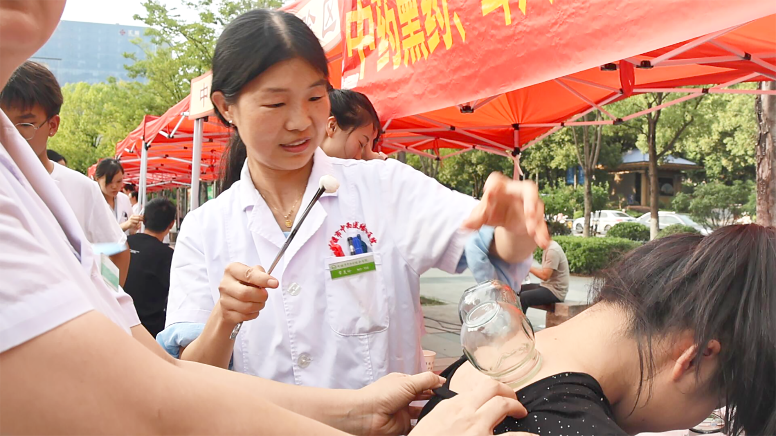 活动现场,医护人员设置健康咨询台,进行中医养生功法展示教学、中医药产品展示,并向市民提供中医健康咨询、适宜技术体验服务。图为市民体验拔罐。通讯员龚伟摄