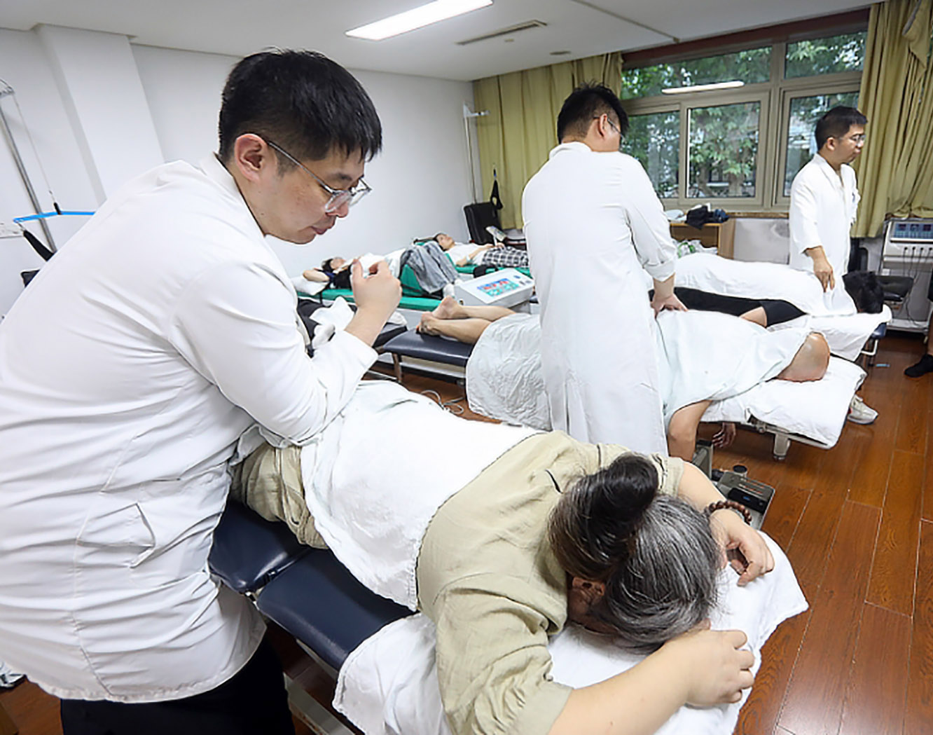 7月7日,小暑节气当天傍晚六点,浙江中医药大学附属第一医院的推拿诊室内灯火通明,副主任中医师钮铭为一位伏案工作者按摩。