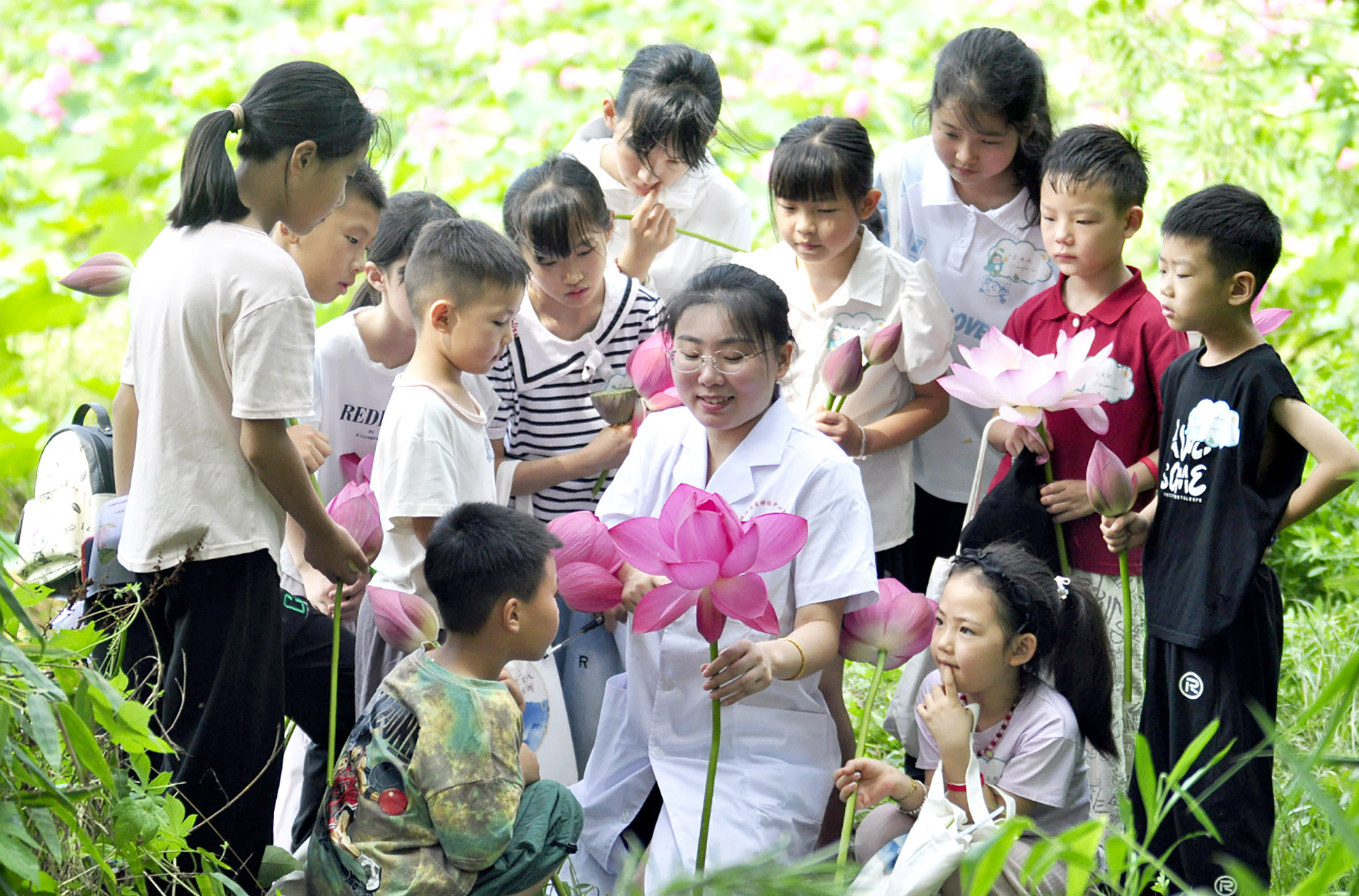 图为7月9日,四川省梓潼县自强镇黎明村荷花镇中心卫生院中药师给自强小学学生讲解荷花的观赏、食用和药用价值。成和平摄