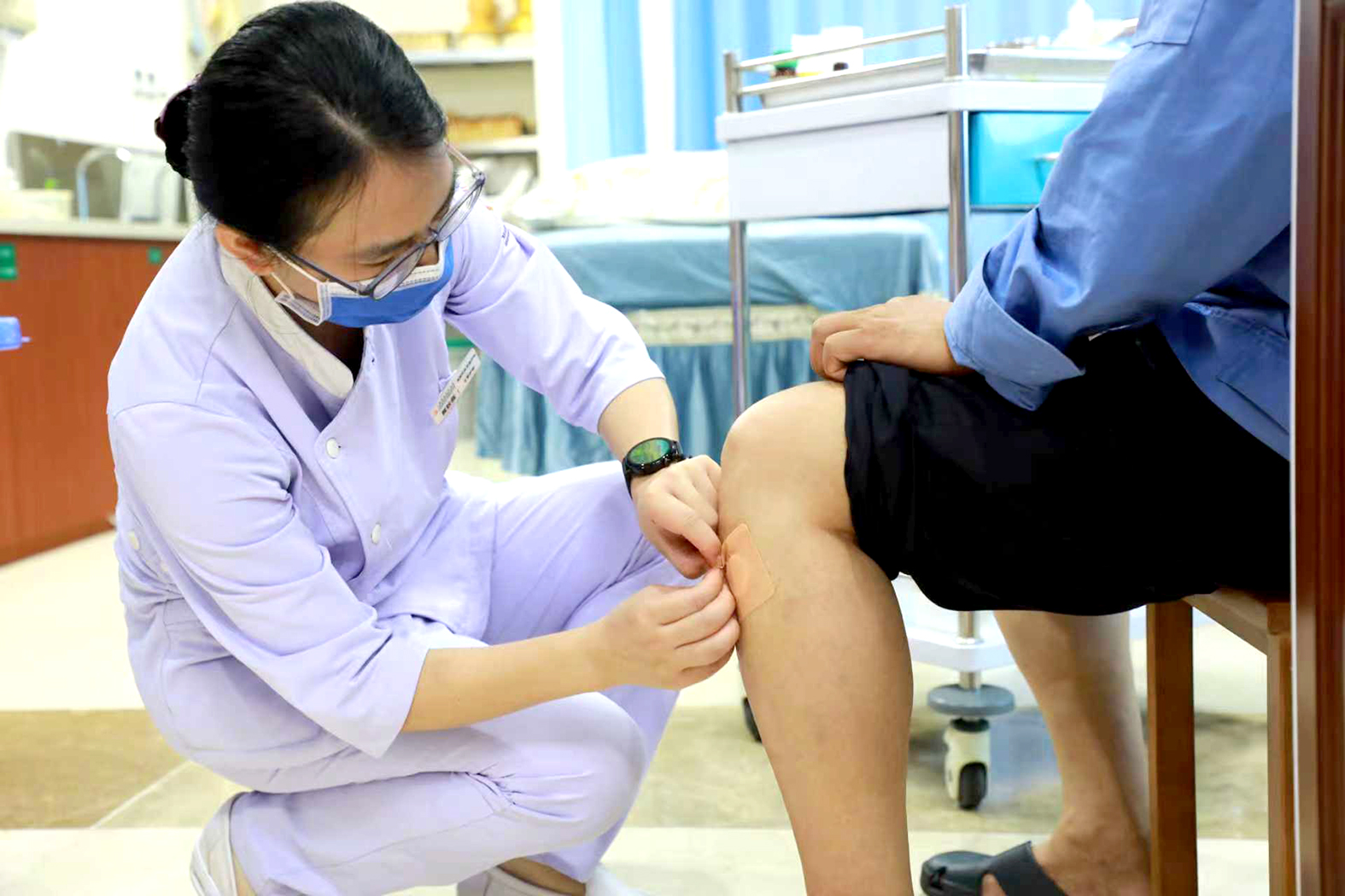 图为护理人员为患者开展贴敷治疗。本报记者王煜霞摄