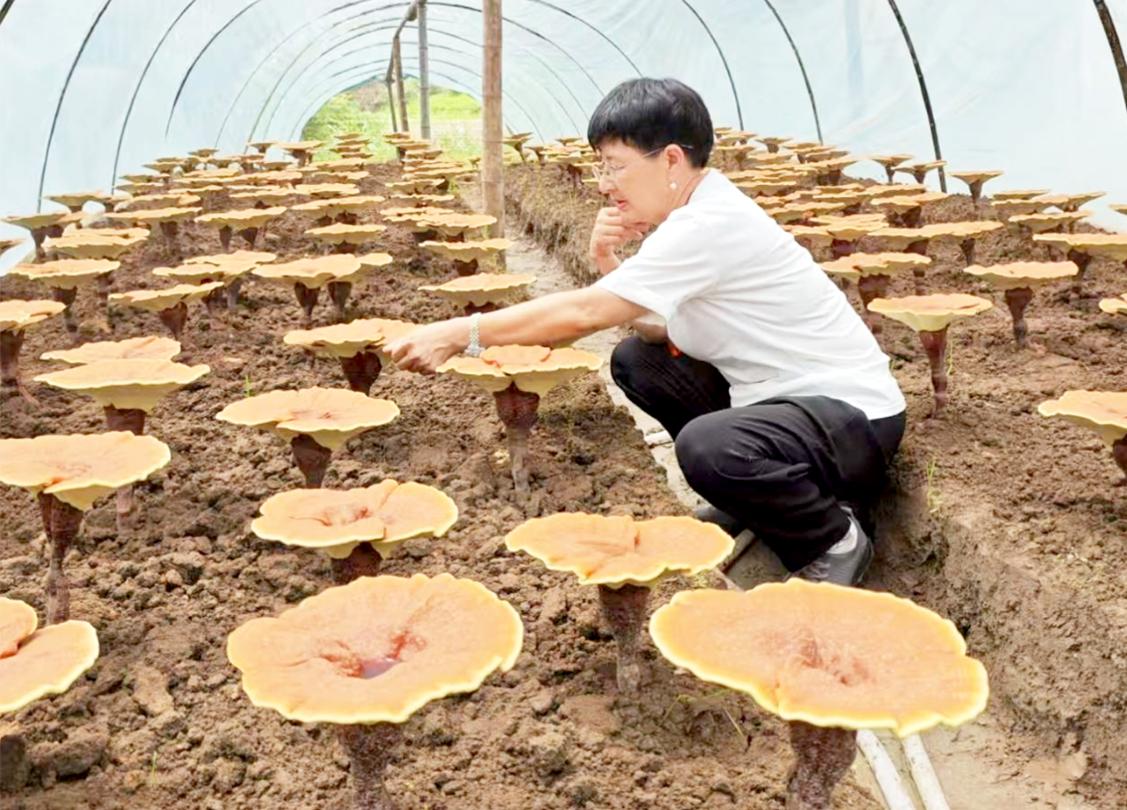 图为在龙泉市八都镇石川村北京京诚灵芝丽红基地,农艺师正在查看灵芝的生长情况。马传贵摄
