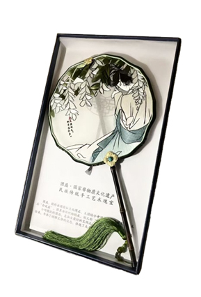 “槐花扇”以具有清热凉血功效的槐花为主题,扇面绘有隋唐服饰女子背影,搭配白居易“槐花满院气”诗句,辅以槐花精油熏染,实现视觉、嗅觉、文化意境的三重融合。