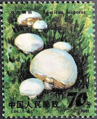 我国邮政部门于1981年8月6日发行《食用菌》特种邮票一套6枚,由潘可明设计。第六枚为双孢蘑菇,画面顶端标有“双孢蘑菇”及其拉丁文学名“Agaricusbisporus”,邮票图案以墨绿色的草丛为背景,描绘了一簇大大小小洁白如玉的双孢蘑菇的形象。