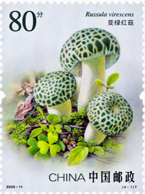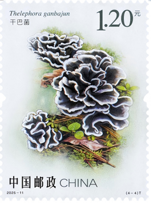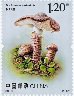 中国邮政于2025年7月12日发行《食用菌(二)》邮票1套4枚,第一枚变绿红菇为红菇科,生长范围广;第二枚中华金耳为白耳科,是2024年我国科研人员利用生命条形码技术首次确认的新菌种;第三枚松口蘑为口蘑科,有“蘑菇之王”美誉;第四枚干巴菌为革菌科,为中国特有菌种。这套邮票延续了1981年《食用菌》的科普特点,由植物科学画家曾孝濂设计,画面细腻,色彩鲜明,融入森林生态背景,使整体形象兼具自然野趣与美学韵味,是近年雅俗共赏、不可多得的国家名片。